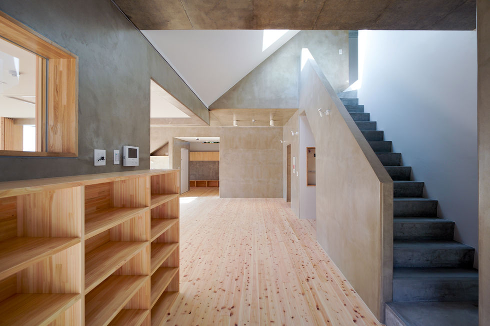 小高い丘の中腹に位置する新設の保育所です。 南側は高台を抑える擁壁が聳え立ち、北側は低地へ降り眺望が広がります。 擁壁に対する条例に基づき安息角の及ぶ範囲の1階および2階床スラブをRC造とし、RC造の利点を活かして柱と壁の少ない大きな保育室を計画しました。園庭の陰が濃くなり過ぎないよう切妻屋根とし、軒を深くすることで陽射しの強い高知でも遊びやすい園庭を目指しました。 室内は時間変化に伴いヴォイドやトップライト、ハイサイドライトから光をプリズムのように反射・拡散しながら導き、順光となる園庭や遠景を借景として季節の移ろいが鮮やかに感じられます。 カーテンの要らない保育所は子ども達の情緒豊かな成長を促す場所となることを願っています。