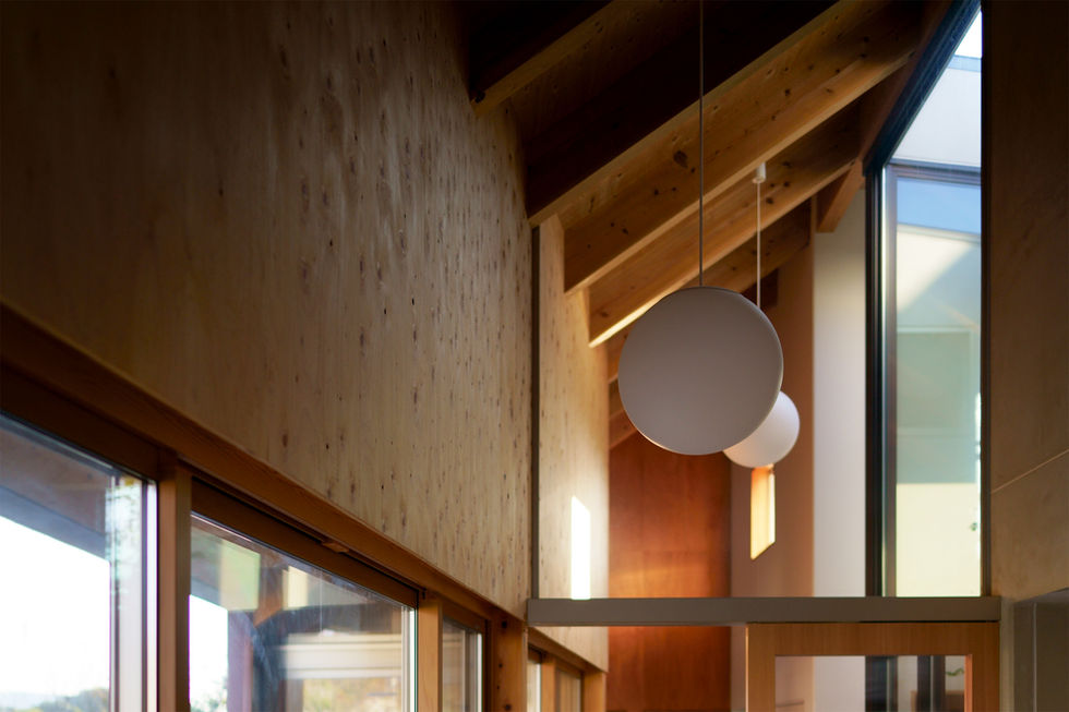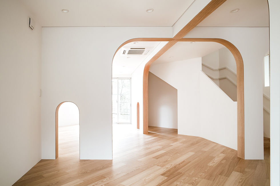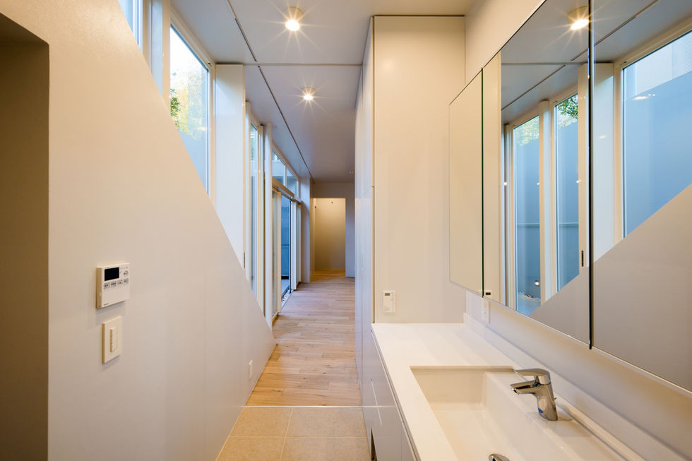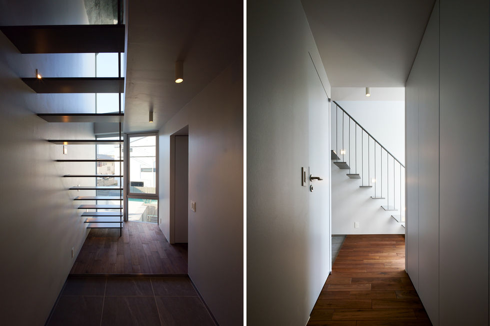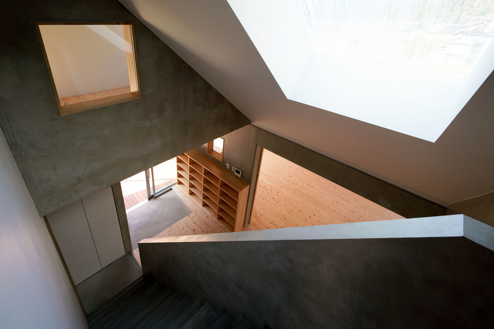 オホーツク海沿岸の高台に建つ夫婦と子ども達のための住宅です。 漁業を営む建主はシーズン中は夜明け前から出漁し夕方前に帰宅、冬季は流氷により漁以外の仕事をして過ごすため季節によって生活のスタイルが変化します。 「大きな中庭が欲しい」そんな建主の言葉から始まったこのプロジェクトは、家族や友人が集うリビングと中庭を中心に、床高や気積の緩急をつけながらリビングとは異なる方角へ開いた居室や2階ホール、バルコニーやガレージをリゾーム状にあえて死角を造りながら繋ぐことで、活動時間が違っても部屋に籠らず諧調する居場所の選択性と、性質の異なるアルコーブのような奥行きを持たせました。 冬はガレージを閉じることでエントランスの風除室を兼ね、夏は車をガレージから出し開放することで、 ダイニングからT字路の先まで連なる半屋外空間として過ごし方や遊び方の幅を広げます。