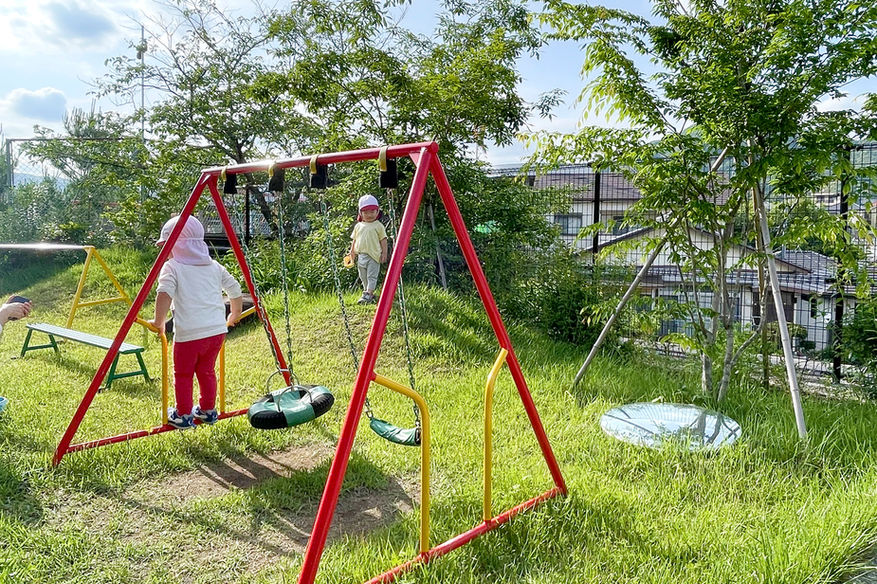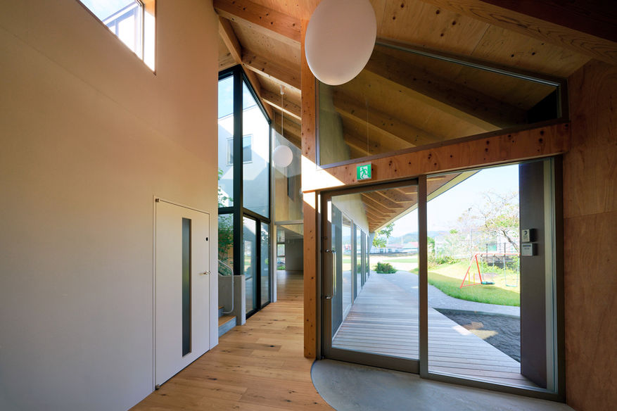 企業主導型保育所という性質上、隣地こども園の保育士や職員の子どもを優先的に預かる保育所として、園庭を一体的に連続させWCを隣地側に設けることで、子ども達の外遊びだけでなく保育士の交流も視覚的、動線的に可能な配置とした。 少子化の進む地方都市では年度によって入園希望者数が変動しやすく、通園する0〜2歳の年次ごとの在園児に合わせて可変する構成を目指した。