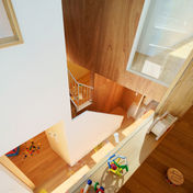 アンパンマン列車が走る土讃線沿の住宅街に建つ企業主導型保育所+病児保育所です。 1階は0~2歳児、 2階は病児を預かる施設として二次感染抑止に配慮しながら職員室を含め複数の保育室の子ども達がお互いを知覚できる構成を目指しました。