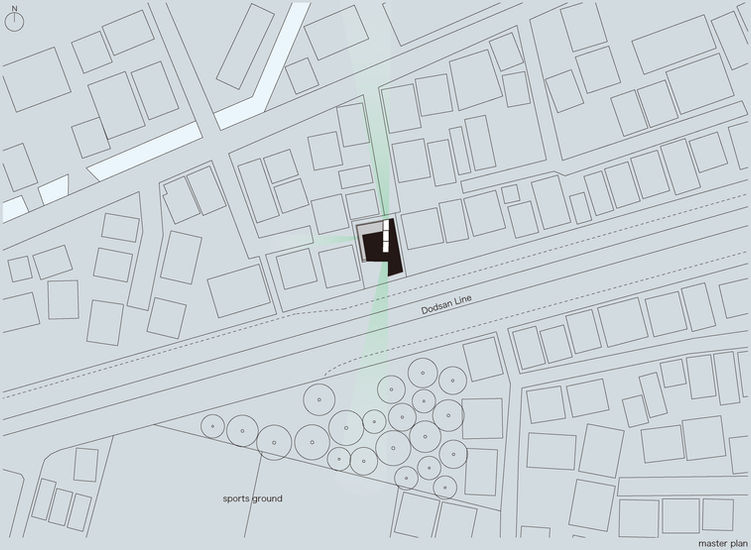 敷地は96年から始まった土讃線の高架化により線路と道路が造られ、それまでは”裏”であった南側が前面道路となった土地である。通り沿いは新しい建物は土讃線側から出入りする造りとなっているが以前のままの家屋もまだ残っている。 病児・病後児保育室を併設した保育所を計画するにあたり、その名残である北側の袋小路や土讃線の先、かつては裏であった緑地やテニスコートなど開けた側を活かせないかと考えた。